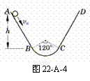 如图22-A-4所示,AB和CD为两个对称斜面,其上部足够长,下部分分别与一个光滑的圆弧面的两端相切,圆弧圆心角为120°,半径R=2.0m,一个质量为m=1kg的物体在离弧高度为h=3.0m处,以初速度4.0m/s沿斜面运动,若物体与两斜面间的动摩擦因数μ=0.2,重力加速度g=10m/s2,则(1)物体在斜面上(不包括圆弧部分)走过路程的最大值为多少?(2)试描述物体最终的运动情况.(3)物体对圆弧最低点的最大压力和最小压力分别为多少?