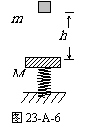 .如图23-A-6所示,质量为M=400g的铁板固定在一根轻弹簧上方,铁板的上表面保持水平。弹簧的下端固定在水平面上,系统处于静止状态。在铁板中心的正上方有一个质量为m=100g的木块,从离铁板上表面高h=80cm处自由下落。木块撞到铁板上以后不再离开,两者一起开始做简谐运动。木块撞到铁板上以后,共同下降了l1=2.0cm时刻,它们的共同速度第一次达到最大值。又继续下降了l2=8.0cm后,它们的共同速度第一次减小为零。空气阻力忽略不计,重力加速度取g=10m/s2。求: ⑴若弹簧的弹力跟弹簧的形变量成正比,比例系数叫做弹簧的劲度,用k表示。求本题中弹簧的劲度k。⑵从木块和铁板共同开始向下运动到它们的共同速度第一次减小到零过程中,弹簧的弹性势能增加了多少?⑶在振动过程中,铁板对木块的弹力的最小值N是多少?
