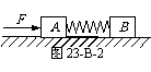 如图23-B-2所示,质量相同的木块A、B用轻弹簧相连,静止在光滑水平面上。弹簧处于自然状态。现用水平恒力F向右推A,则从开始推A到弹簧第一次被压缩到最短的过程中,下列说法中正确的是 ( )
