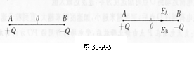 11.如图30-A-5所示,在真空中,带电量分别为+Q和-Q的点电荷A、B相距r,则(1)两点电荷连线的中点O的场强多大?(2)距A、B两点都为r的O'点的场强如何?