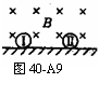 如图40-A9所示,在光滑的水平面上方有一垂直纸面向里、磁感应强度为B的匀强磁场,在水平面上有质量为m的不带电小球I向右运动,与质量为2m、带电量为q的静止小球Ⅱ正碰后粘在一起运动,若碰撞后两球对水平桌面的总压力恰好等于mg,则碰撞前小球I的速度大小为