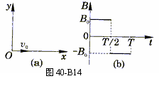 12.如图40-B14(a)所示,在坐标xoy平面的第一象限内,有一个匀强磁场,磁感应强度大小恒为B0,方向垂直于xoy平面,且随时间做周期性变化,如图(b)所示,规定垂直xoy平面向里的磁场方向为正.一个质量为m,电量为q的正粒子,在t=0时刻从坐标原点以初速度vo沿x轴正方向射入,在匀强磁场中运动,经过一个磁场变化周期T(未确定)的时间,粒子到达第一象限内的某一点P,且速度方向沿x轴正方向(不考虑重力作用).