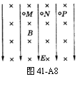 如图41-A8所示,匀强电场E的方向竖直向下,匀强磁场B的方向垂直纸面向里,让三个带有等量同种电荷的油滴M、N、P进入该区域中,M进入后能向左做匀速运动,N进入后能在竖直平面内做匀速圆周运动,P进入后能向右做匀速运动,不计空气阻力,则三个油滴的质量关系是