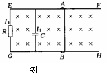 (2002年高考) 图42-B11中EF、GH为平行的金属导轨,其电阻可不计,R为电阻器,C为电容器,AB为可在EF和GH上滑动的导体横杆.有均匀磁场垂直于导轨平面,方向向纸内,若用I1和I2分别表示图中该处导线中的电流,则当横杆AB( )