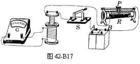 14.图42-B17为“研究电磁感应现象”的装置示意图.已知电流从正接线柱流入电流表时,指针向右偏转. (1)闭合开关S稳定后,将滑动变阻器的滑动触头P向右滑动,发现电流表指针向右偏转,则可断定电源的正极是 . (2)以下做法能使电流表指针向左偏转的是 .