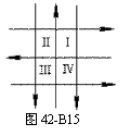在一个平面内有6根彼此绝缘的通电直导线,电流方向如图42-B15所示,各导线的电流大小相等,Ⅰ、Ⅱ、Ⅲ、Ⅳ4个区域的面积相等,则垂直纸面指向纸内磁通量最大的区域是______,垂直纸面指向纸外磁通量最大的区域是_______