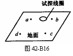 (2002年上海高考)已知某一区域的地下埋有一根与地表面平行的直线电缆,电缆中通有变化的电流,在其周围有变化的磁场,因此可以通过在地面上测量闭合试探小线圈中的感应电动势,来探测电缆的确切位置、走向和深度.当线圈平面平行地面测量时,在地面上a、c两处测得试探线圈中的电动势为零,b、d两处线圈中的电动势不为零;当线圈平面与地面成45°夹角时,在b、d两处测得试探线圈中的电动势为零.经过测量发现,a、b、c、d恰好位于边长为1m的正方形的四个顶角上,如图42-B16所示.据此可以判定地下电缆在 两点连线的正下方,离地表面的深度为