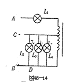 3. 如图46-14所示,为一理想自耦变压器示意图,L1、L2、L3、L4为四个完全相同的灯泡,在A、B两点加交变电压U1时,四个灯泡都同样正常发光,设C、D两端的电压为U2,则U1:U2 ( )