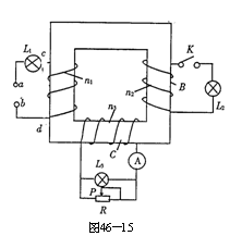 如图46-15所示为双输出的理想变压器,其中A为输入端线圈,B、C为两个输出端线圈,且n1:n2:n3=3:2:1,灯L1标有“6V 6W”的字样,当ab接有18V的交流电时,L1正常发光,电流表的读数为0.5A,那么