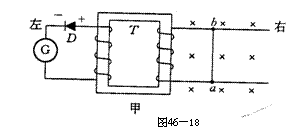 8.图46-18中T是绕有两组线圈的闭合铁心,线圈的绕向如图所示,D是理想的二极管,是一种电子线路的重要元件,它具有单向导电性,即电流只能从其正极流向负极,金属棒ab可在两条平行的金属导轨上沿导轨滑行,磁场方向垂直纸面向里,若电流计G中有电流通过,则ab棒的运动可能是( )