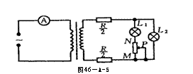 4.如图46-A-5所示,用理想变压器给负载供电,变压器输入电压不变,变压器降压后用总电阻为R的输电线对用电器供电,设两盏灯泡的电阻相同,且都在发光,若将滑动变阻器的触头P向N端滑动,会出现的现象是 ( )