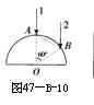 半径为R的玻璃半圆柱体,横截面如图47-B-10,圆心为O 。两束平行单色红光沿截面射向圆柱面,方向与底面垂直,光线1的入射点A为圆柱面的顶点,光线2的入射点为B,∠AOB=60°,已知该玻璃对红光的折射率n=