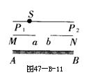 11. 如图47-B-11,AB表示一直立的平面镜P1P2是水平放置的米尺(有刻度的一面朝着平面镜),M、N是屏,三者互相平行。屏MN上的ab表示一条竖直的缝(即ab之间是透光的)某人眼睛紧贴米尺的小孔S(其位置见图),可通过平面镜看到米尺的一部分刻度。试在本题的图上用三角板作图求出可看到的部位,并在P1P2上把这部分涂以标志