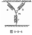 如图9-B-6所示,小球质量为m,被3根质量不计的相同弹簧a、b、c拉住,其中c在竖直方向,a、b、c之间的夹角均为120o,小球平衡时,a、b、c的弹力大小之比为3:3:1.当剪断c的瞬间,小球的加速度及方向可能为 ( )