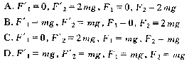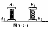 物块A1、A2、B1和B2的质量均为m,A1、A2用刚性轻杆连结,B1、B2用轻质弹簧连结.两个装置都放在水平的支托物上,处于平衡状态,如图9-B-9所示.今突然迅速地撤去支托物,让物块下落,在除去支托物的瞬间,A1、A2受到的合力分别为F1,,和F2,,Bl、B2:受到的合力分别为Fl和F2:,则 ( )