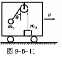 11.车厢顶部固定一滑轮,在跨过定滑轮绳子的两端各系二个物体,质量分别为ml、m2,且m2>ml,m2静止在车厢底板上,当车厢向右运动时,系m1的那段绳子与竖直方向夹角为θ,如图9-B-11所示,若滑轮、绳子的质量和摩擦忽略不计,求:(1)车厢的加速度;(2)车厢底板对m2的支持力和摩擦力.