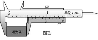 ② 如图乙所示,用游标卡尺测得遮光条的宽度d= cm;实验时将滑块从图示位置从静止到释放,由数字计时器读出遮光条通过光电门的时间Δt=1.2×10-2s,则滑块经过光电门时的瞬时速度为 m/s.