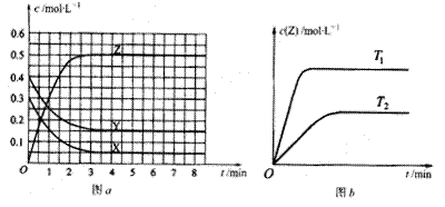 Z(g)(未配平)。温度为T0时,在容积固定的容器中发生反应,各物质的浓度随时间变化的关系如图a所示。其他条件相同,温度分别为T1、T2时发生反应,Z的浓度随时间变化的关系如图b所示。下列叙述正确的是
