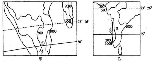(1)甲图所示区域与乙图所示区域 (南部) 降水的空间分布有何差异? 分析差异产生的原因。(10分)