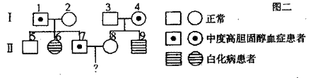 (3)下图二是对该高胆醇血症和白化病患者家庭的调查情况,II7和II8生一个同时患这两种病的孩子的概率是 ,为避免生下患这两种病的孩子,II8必需进行的产前诊断方法是 。若II7和II8生了一个患严重高胆固醇血症的孩子,其最可能的原因是 。