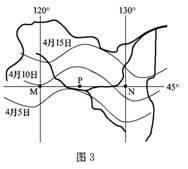 图3为某地季节性积雪融化完毕日期等值线及水系分布图,读图回答25-26题。