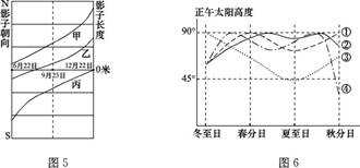 图5为甲、乙、丙三地6月22日至l2月22日等高旗杆正午影子变化曲线和朝向示意图。读图回答31-32颢。