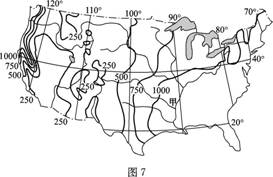 33.(30分)读美国年等降水量线分布图(单位:mm,图7),回答下列问题。