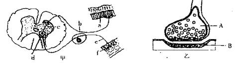 (1)甲图中f表示的结构是 ,乙图是甲图中____(填字母)的亚显微结构放大模式图,乙图中的B为一个神经元的 。
