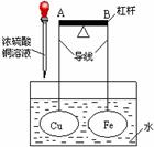 如图所示,杠杆A、B两端分别挂有体积相同、质量相等的空心铜球和空心铁球,调节杠杆并使其在水中保持平衡,小心地向水槽中滴入CuSO4 浓溶液。(该过程中不考虑两球浮力的变化)下列说法正确的是( )