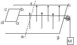 13.(12分)、如图所示,在水平绝缘光滑的实验平台上放置一正方形线框abcd,线框边的边长l=1m,线框的质量m=2kg,电阻R=0.1Ω。线框通过绝缘细线与重物相连,重物质量M=3kg,平台上ef线(ef∥gh)的右方有竖直向上的匀强磁场,磁感应强度B=0.5T,如果线框从静止开始运动,进入磁场最初一段时间是匀速的,ef线和gh线的距离s=6m,(取g=10m/s2),求: