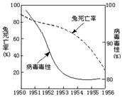 10.1950年,为除去对农作物构成重大危害的兔,澳洲使用了能引起兔致命疾病的病毒。右图是对此后六年间兔的致死率和病毒的毒性变化进行调