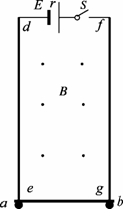24.(崇文区)(20分)如图所示,de和fg是两根足够长且固定在竖直方向上的光滑金属导轨,导轨间距离为L,电阻忽略不计。在导轨的上端接电动势为E,内阻为r的电源。一质量为m、电阻为R的导体棒ab水平放置于导轨下端e、g处,并与导轨始终接触良好。导体棒与金属导轨、电源、开关构成闭合回路,整个装置所处平面与水平匀强磁场垂直,磁场的磁感应强度为B,方向垂直于纸面向外。已知接通开关S后,导体棒ab由静止开始向上加速运动,求: