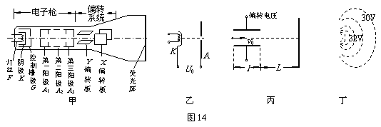 (3)如图14甲所示,电子枪中灯丝用来加热阴极,使阴极发射电子。控制栅极的电势比阴极低,调节阴极与控制栅极之间的电压,可控制通过栅极电子的数量。现要使电子打在荧光屏上电子的数量增加,应如何调节阴极与控制栅极之间的电压。