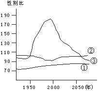 人口性别结构是指一个国家或地区两性人口数量的比例关系,它通常由性别比这个指标加以度量。性别比为平均每100个女性所相应男性人口数量。读下图并回答11-13题: