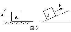 图3所示,已知物体A和B质量相等,A在粗糙的水平地面,B在光滑的斜面。现它们分别在同样大小的力F作用下沿F的方向分别移动了距离S,则F对物体做的功
