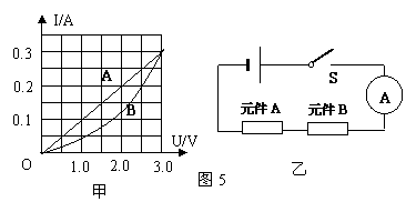 12.有两个电路元件A和B,流过元件的电流与其两端电压的关系如图5(甲)所示。把它们串联在电路中,如图5(乙)所示。闭合开关S,这时电流表的示数为0.2A,则电源电压和元件B的电功率分别是