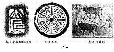 12.从图8的秦印、汉瓦与画像石中,可以获得的历史信息是