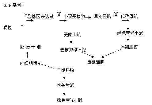44.GFP基因可作为目的基因用于培育绿色荧光小鼠,下图表示大量培育绿色荧光小鼠流程图以及其的拓展图和应用。请据图回答问题。17分