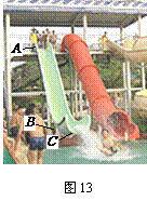 如图13所示,水上滑梯由斜槽AB和水平槽BC构成,AB与BC圆滑连接,斜槽AB的竖直高度H=15m,BC面高出水面的距离h=0.80m。一个质量m=50kg的游戏者从滑梯顶端A点由静止滑下,g取10m/s2。