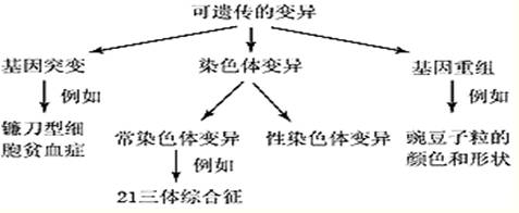 44.生物的变异包括可遗传变异和不可遗传变异,可遗传变异的来源有基因突变、基因重组和染色体变异,请根据相关知识完成下列概念图。(4分)