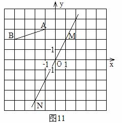 如图11,在方格纸上建立平面直角坐标系,线段AB的两个端点都在格点上,直线MN经过坐标原点,且点M的坐标是(1,2)。
