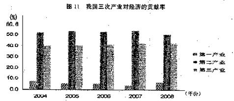 (1)①表3反映了近五年我国消费需求对经济的贡献率不断增大,但低于世界平均水平;投资贡献率远高于世界平均水平,并持续攀升;出口贡献率不稳,受国际金融危机影响,近两年下滑严重。(2分)图11反映了近五年第三产业对经济的贡献在增加,但我国经济增长主要还是依靠第二产业。(2分)表4反映了与发达国家相比,我国资源消耗率高、能源利用率低、科技进步对经济增长的贡献率低。总的来说,我国经济结构不协调。(2分)