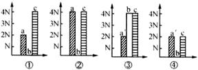 二次分裂后期的染色体数为 a/,染色单体数为b,DNA分子数为c的图示中,属于有丝分裂后期和减数第二次分裂后期的分别是 ( )