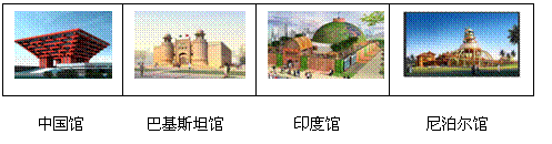 29. 2010年,全世界的目光将聚焦上海世博会。届时,各国和各地区将通过自己独特的建筑风格、科技和工业产品等方式展示城市文明成果。下面是部分亚洲国家的展馆示意图。观察图片,回答问题。