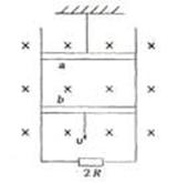 26.(21分)间距为L的平行光滑导轨固定在竖直平面同,磁感应强度为B,方向水平的匀强磁场与导轨平面垂直,二根水平导体棒a、b的质量均为m,电阻均为R,横跨在导轨上且与导轨接触良好,其中a棒中心用一细线悬挂,导轨的下端连接阻值为2R的电阻,如图所示。线能承受的最大拉力为1.5mg。开始二棒紧靠在一起,释放b棒,b棒在运动过程中,始终与导轨垂直,当b棒下落h高时,绳恰好拉断。(重力加速度为g)