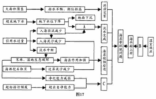 图17为“黄河三角洲某海岸带环境问题示意图”。读图回答下列问题。(10分)