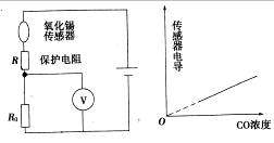 氧化锡传感器主要用于汽车尾气中一氧化碳浓度的检测.它的电阻随一氧化碳浓度的变化而变化,在图所示的电路中,不同的一氧化碳浓度对应着传感器的不同电阻,这样,显示仪表的指针就与一氧化碳浓度有了对应关系,观察仪表指针就能判断一氧化浓度是否超标.有一种氧化锡传感器,其技术资料中给出的是电导(即电阻的倒数)--浓度曲线如图所示,请判断,电压表示数