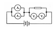 [例8]如图所示,四个相同的电流表分别改装成两个安培表和两个伏特表。安培表A1的量程大于A2的量程,伏特表V1的量程大于V2的量程,把它们按图接入电路,则