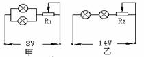 如图所示,把两相同的电灯分别拉成甲、乙两种电路,甲电路所加的电压为8V,乙电路所加的电压为14V。调节变阻器R1和R2使两灯都正常发光,此时变阻器消耗的电功率分别为P甲和P乙,下列关系中正确的是( )