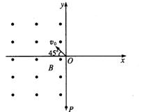 、方向未知的匀强电场.现有一质量为m、带电荷量为-q的微粒(重力不计),自坐标原点O以初速度v0沿与x轴负方向成450角垂直射入磁场,经过y轴上的P(0,-L)点射入电场区域,微粒进入电场后,在电场力的作用下又经P(0,-L)点返回磁场区域,经一段时间后微粒再次离开磁场进入电场.求: